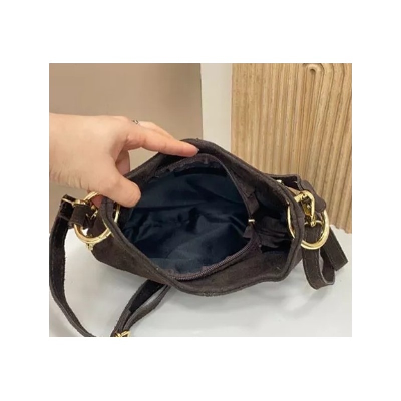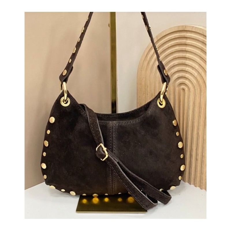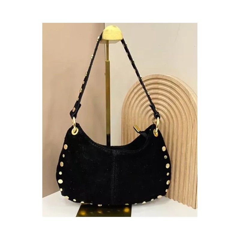 Bolso de hombro. Piel serraje con tachuelas. Forro. Cierre cremallera.