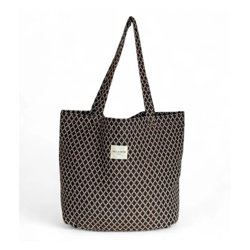 Bolsa shopper grande con asas para llevar al hombro. Con tejido grueso de jacquard con estampado geométrico en tono marrón. Para su correcto mantenimiento se aconseja lavarlo en frío a mano y no utilizar la secadora.