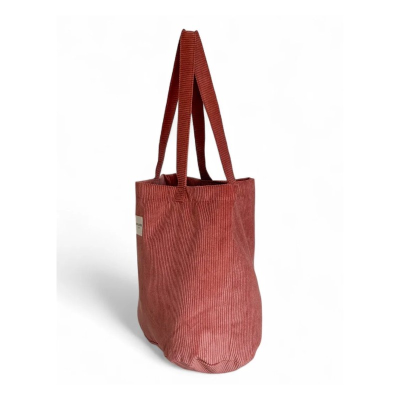 Bolsa shopper grande con asas para llevar al hombro. Con tejido grueso de pana de color coral. Para su correcto mantenimiento se aconseja lavarlo en frío a mano y no utilizar la secadora.