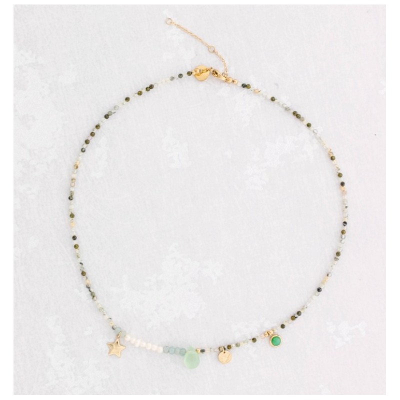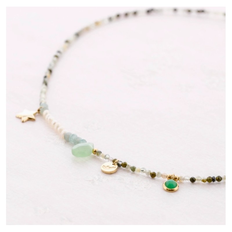 Colgante de minerales y acero tipo gargantilla con charms.