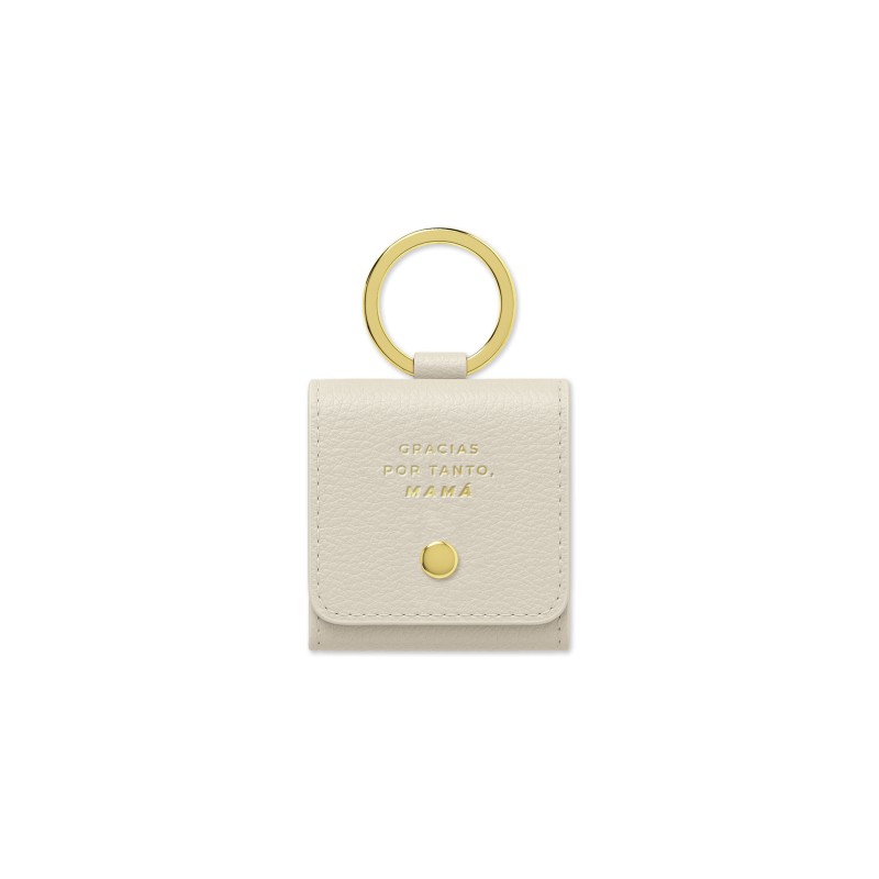 Por fuera, el mensaje en dorado “Gracias por tanto, mamá”, grabado sobre cuero vegano con cierre de corchete.
