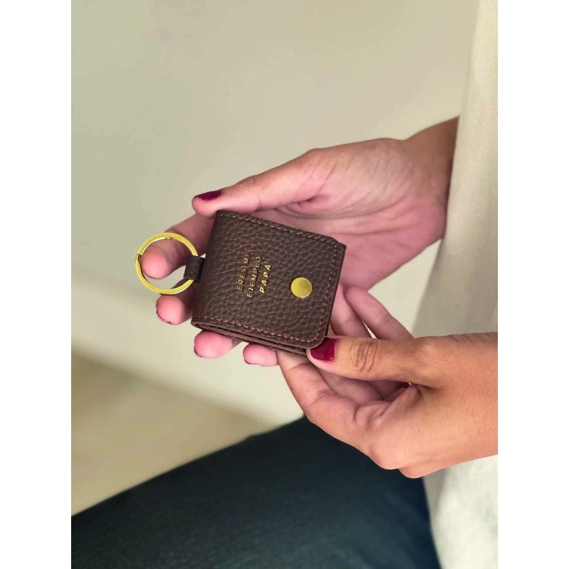 Por fuera, un gesto sencillo: cuero vegano, cierre de corchete, letras doradas que dicen “Eres mi ejemplo, papá”.