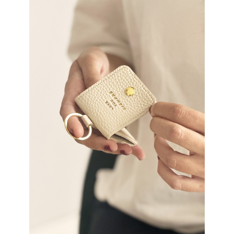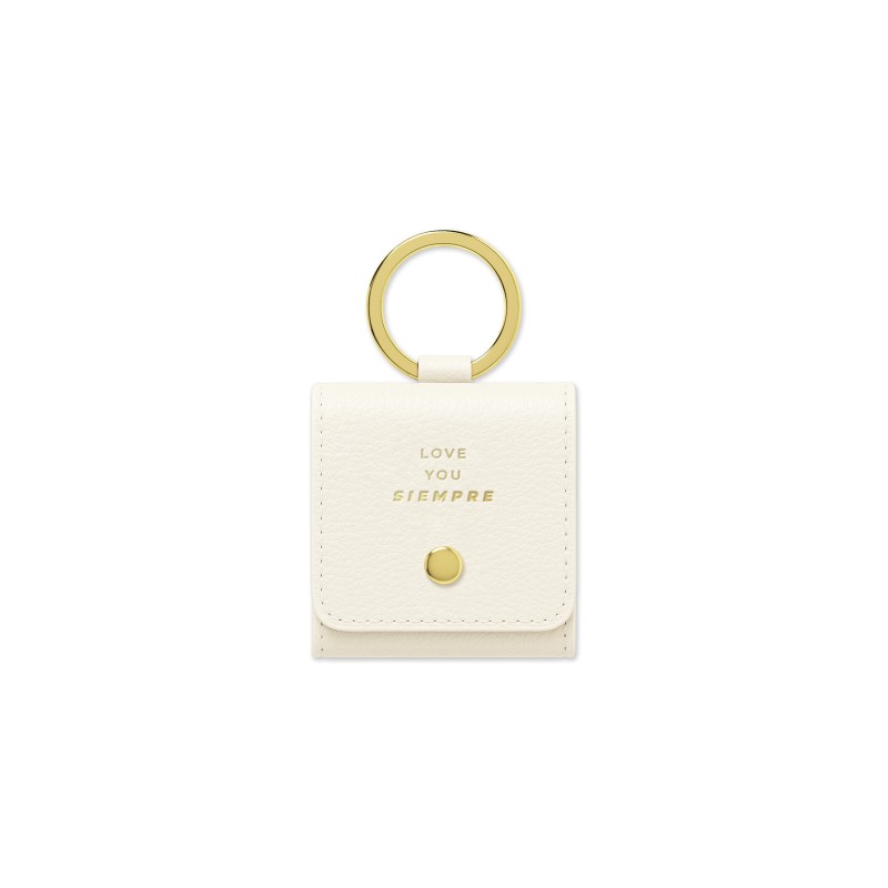 Detalles en dorado en el stamping, corchete de cierre y anilla cuelga-llaves.