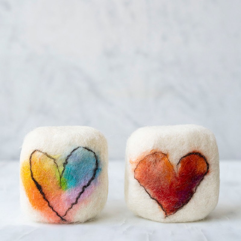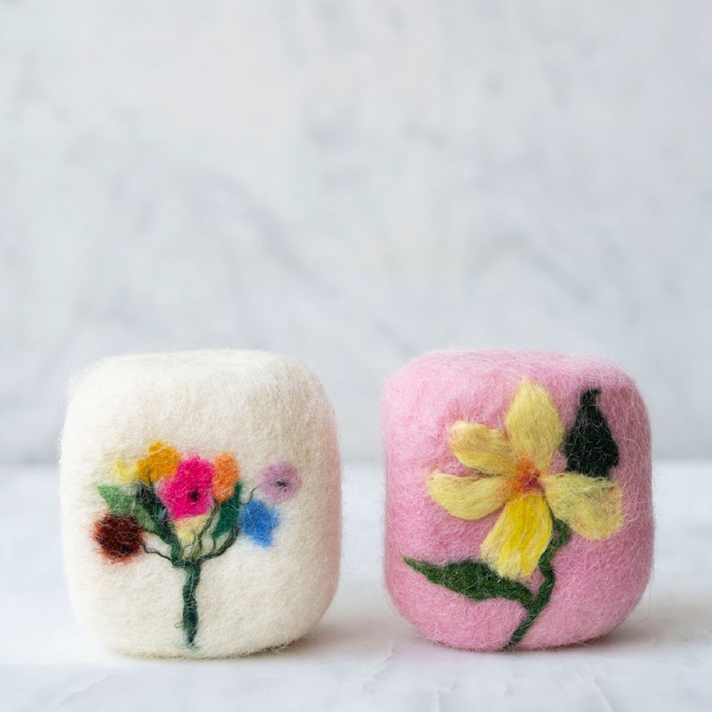Dos piezas de jabón artesanal de aceite de oliva y aceite de coco 100% prensado en frio, recubierto de lana de oveja afieltrada a mano.