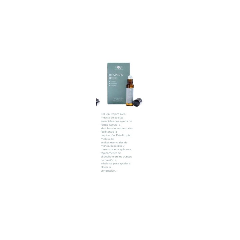 RESPIRA BIEN (MENTA, EUCALIPTO, ROMERO): Mezcla de aceites esenciales que ayuda de forma natural a abrir las vías respiratorias, facilitando la respiración. Esta limpia mezcla de aceites esenciales de menta, eucalipto y romero puede aplicarse tópicamente en el pecho o en los puntos de presión e inhalarse para ayudar a aliviar la congestión.
