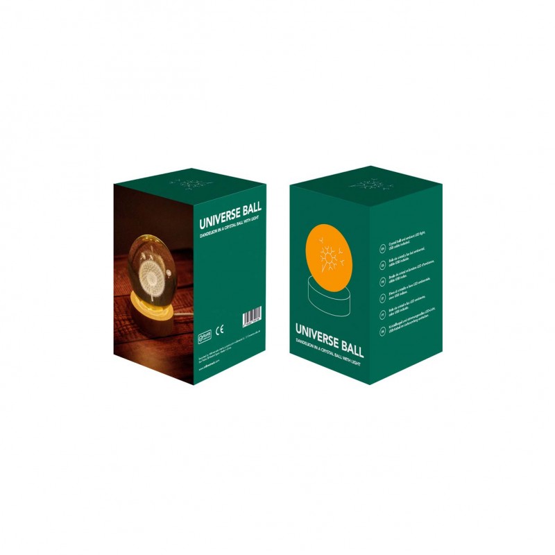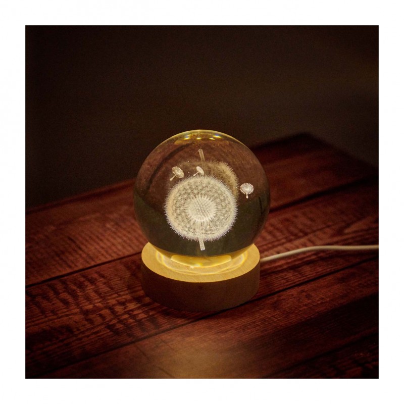Estas pequeñas bolas de cristal luminosas combinan una elegante esfera de cristal con una base de madera. La esfera tiene grabado en 3D un diente de león.