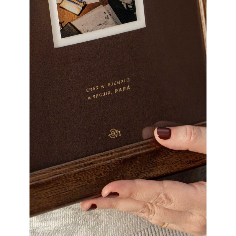 Nuestros marcos en acabado madera han sido diseñados para convertirse en un regalo único y lleno de significado. Cada pieza incorpora un paspartú entelado y delicados detalles en stamping dorado, que aportan un aire elegante y atemporal. Un diseño pensado para realzar lo verdaderamente importante: la fotografía que elijas colocar en su interior.