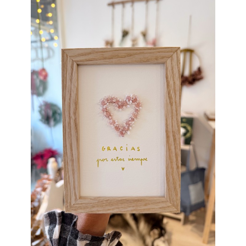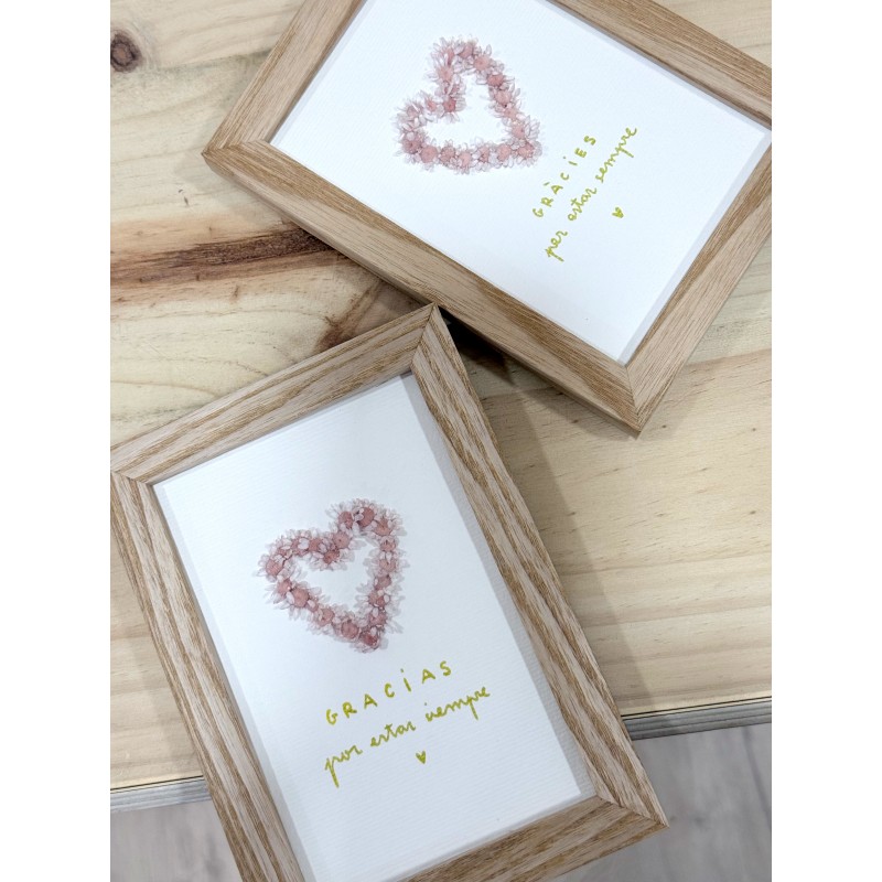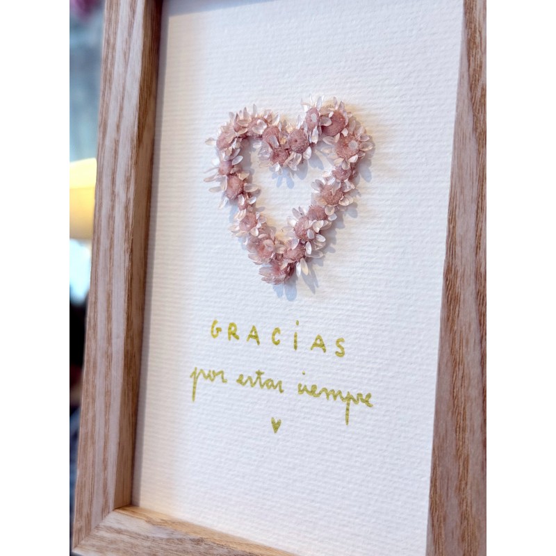 Interior: Corazón de flor natural preservada y mensaje en letra dorada (elegir entre castellano o valencià.