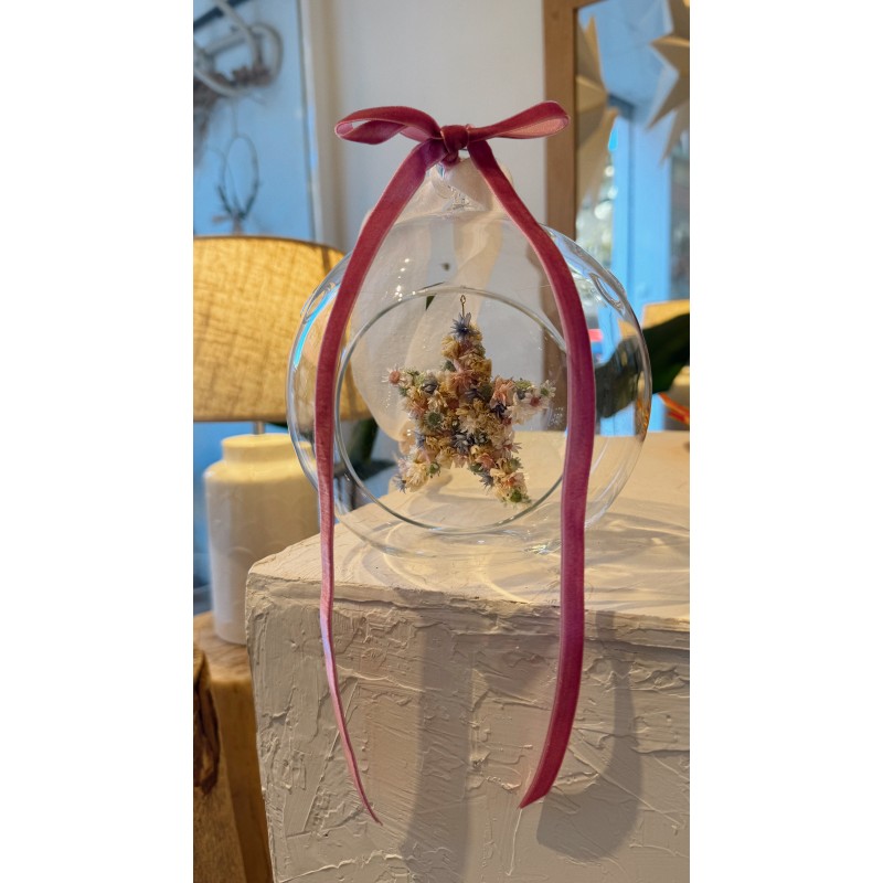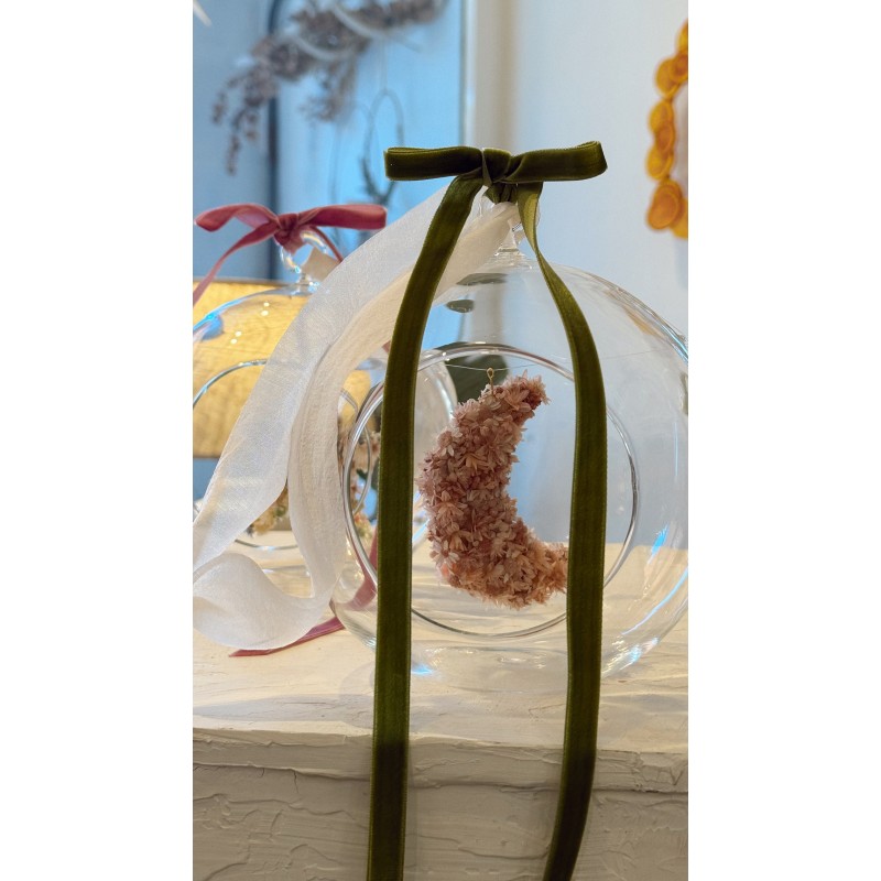 Bola de cristal con ojal y abertura, con lazo de organza beig para colgar y lacito de terciopelo.