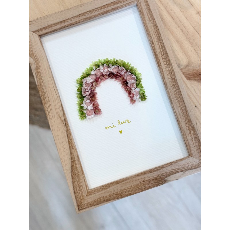 Interior: Arcoíris de flor natural preservada y mensaje en letra dorada.