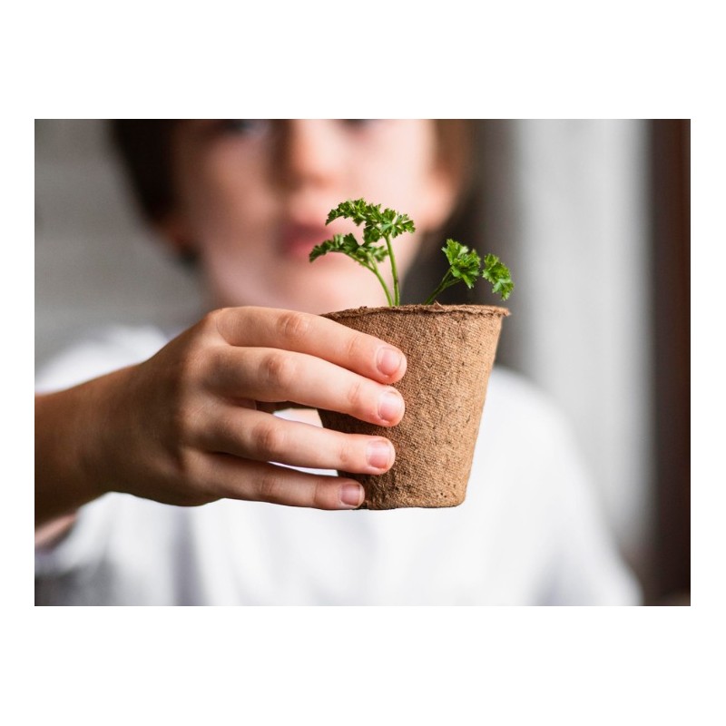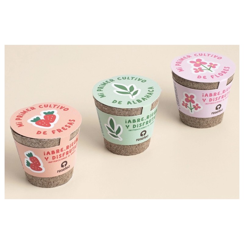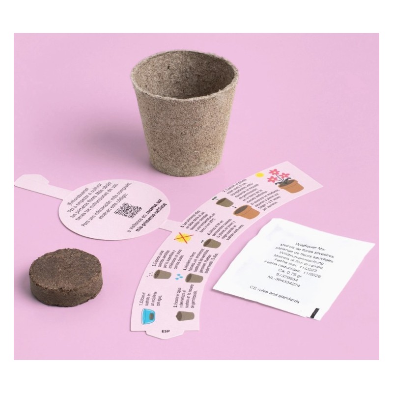 Cada kit incluye una maceta de germinación biodegradable, una pastilla de sustrato y un sobre de semillas.