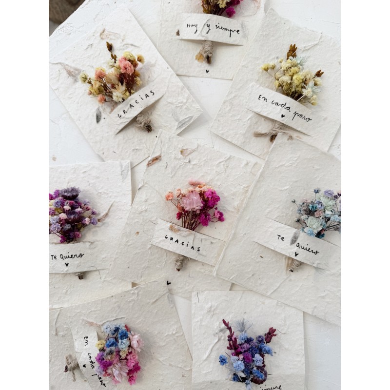 Postal de papel rústico de semillas, decorada con flor natural preservada y mensaje escrito a mano.