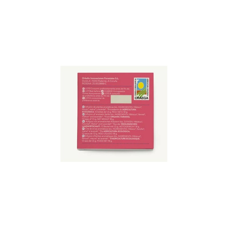 Ingredientes: hibisco, lavanda, malva e hinojo 100% ecológica. Vegana. Sin cafeína ni teína.