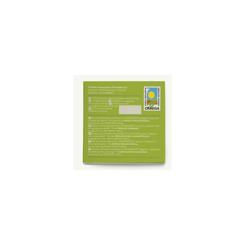 Ingredientes: regaliz, mejorana y pétalos de azahar 100% ecológicos. Vegana. Sin cafeína ni teína.