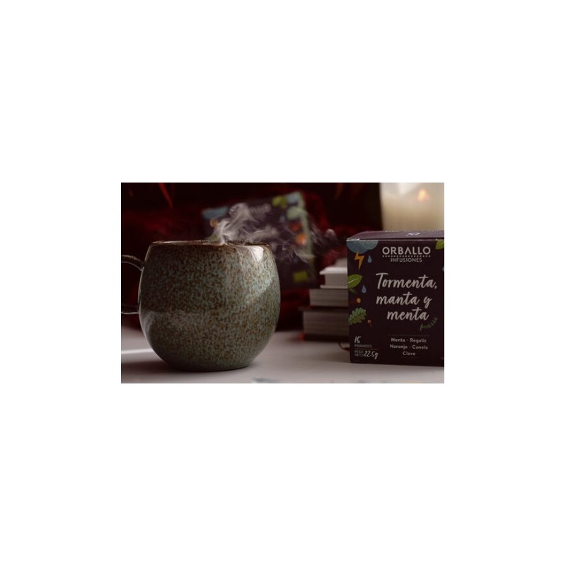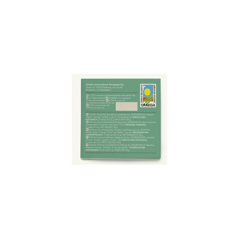 Ingredientes: menta, regaliz, naranja, canela y clavo 100% ecológicos. Vegana. Sin cafeína ni teína.