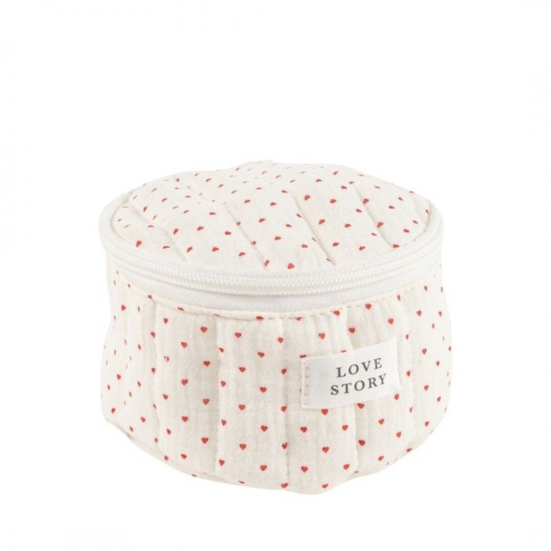 Joyero de tela de muselina con estampado de corazones. Cierre mediante cremallera.