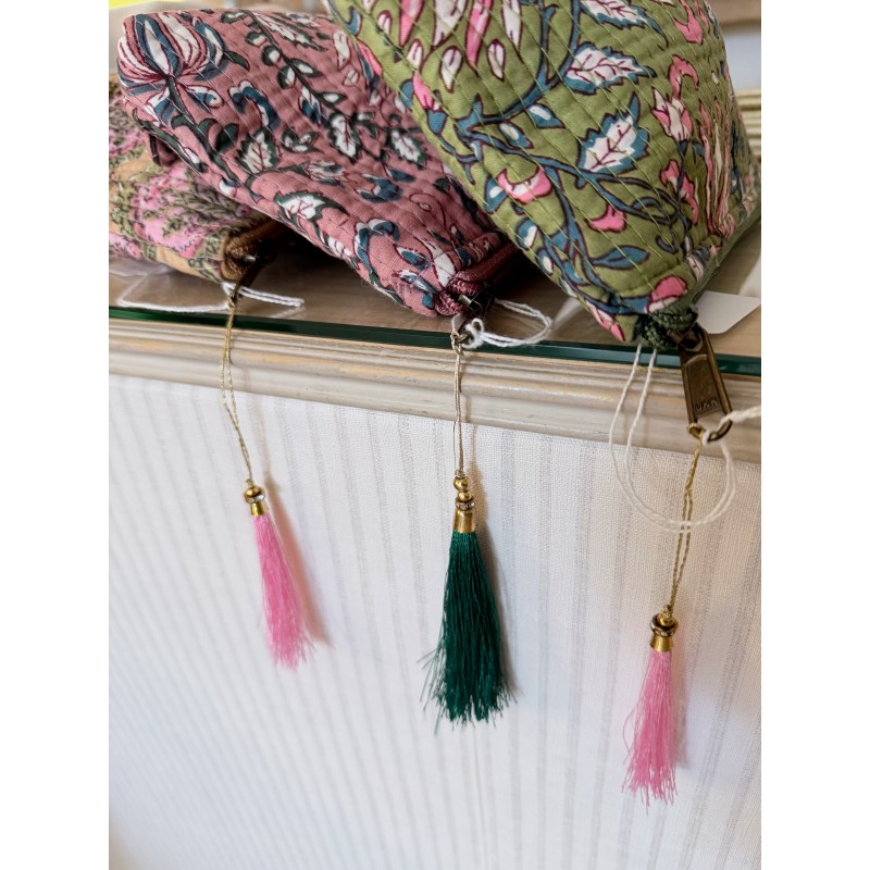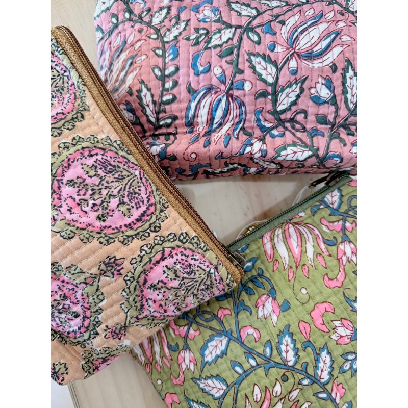Neceser estampado acolchado, con forro, cierre con cremallera y adorno de pompon.