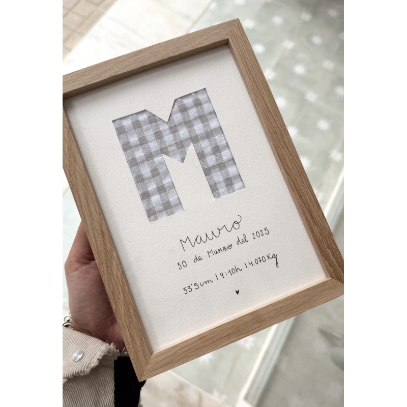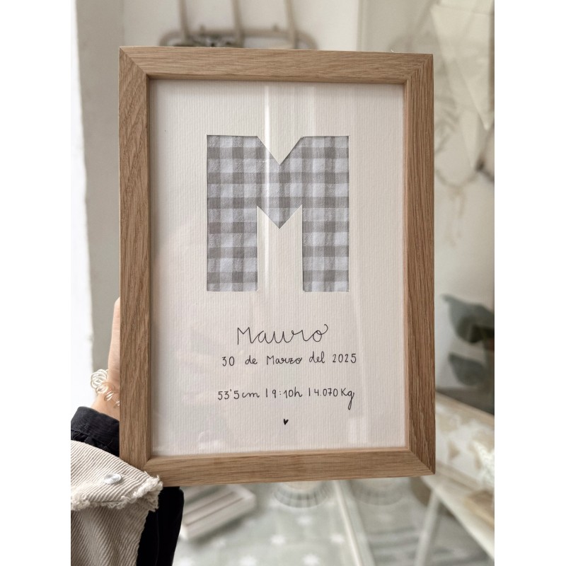 Marco de madera con inicial y datos de nacimiento a personalizar.