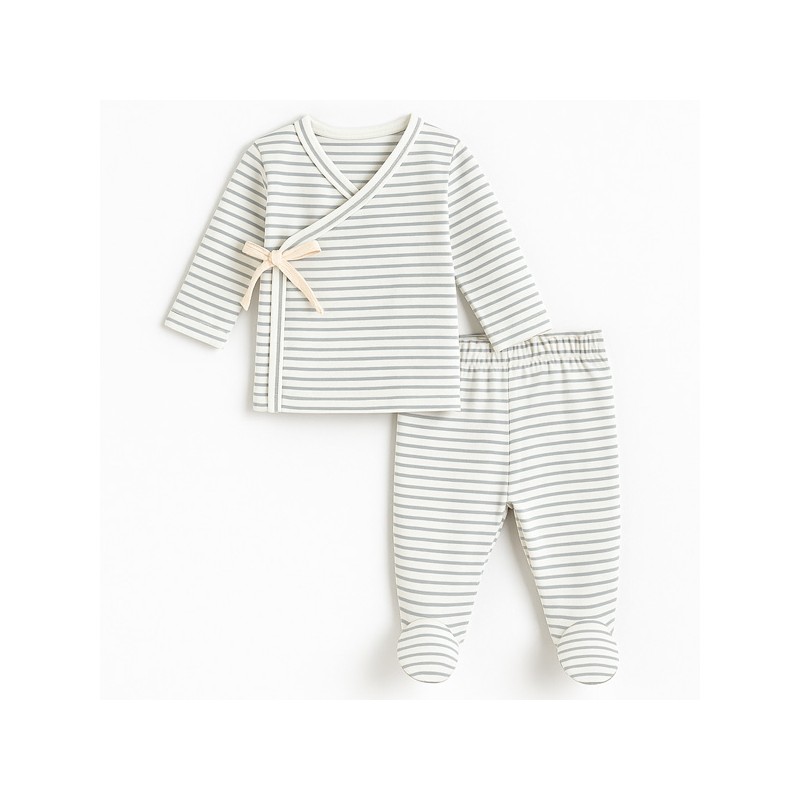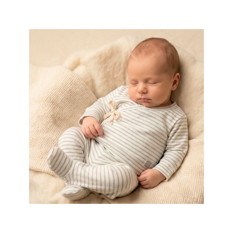 Conjunto de recién nacido compuesto por jubón cruzado con lazo lateral y polaina con pies, confeccionado en algodón hipoalergénico.