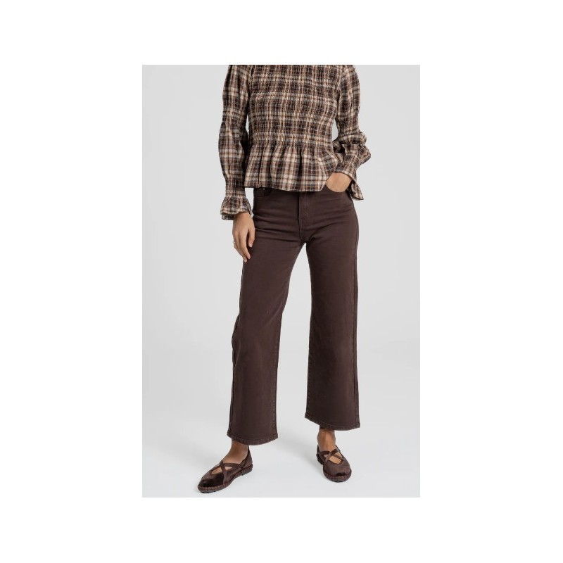 Tejido mezcla de algodón. Tiro alto. Cinco bolsillos. Cierre cremallera y botón. Diseño recto.