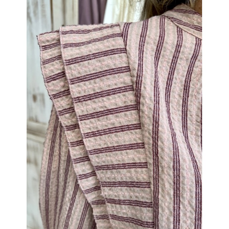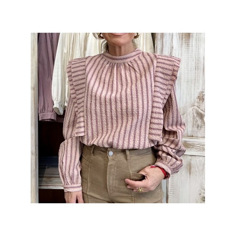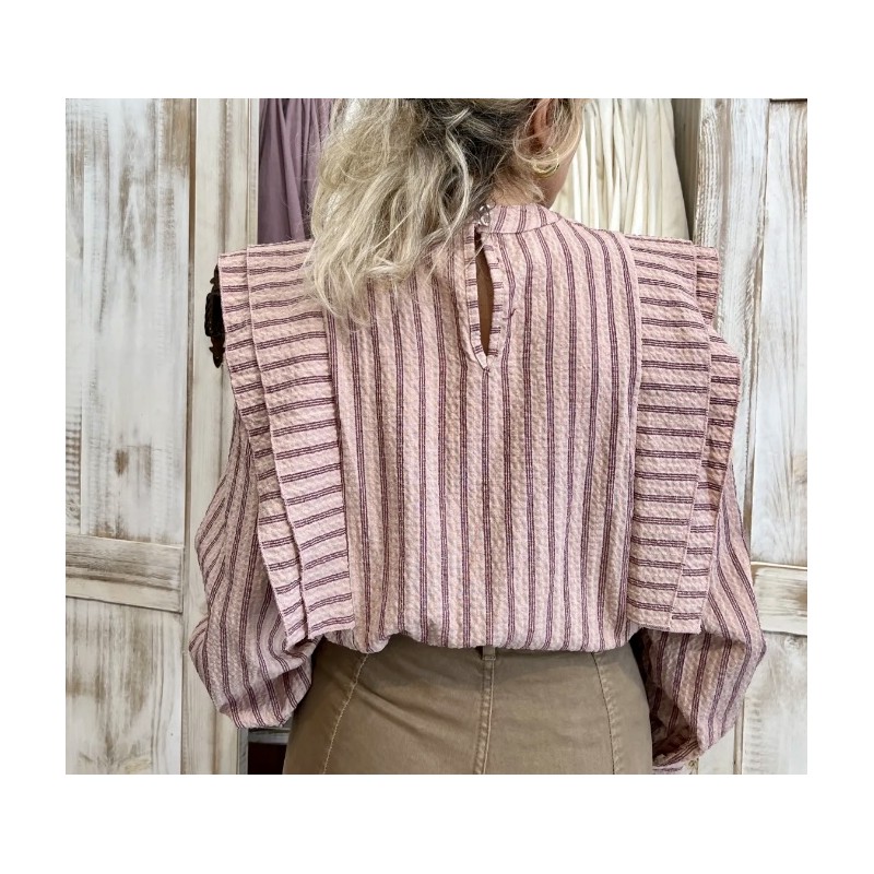 Blusa estampada de rayas combinadas en tonos rosas, latte y burdeos. Cuello mao, abotonada en cuello trasera, puño con botón a tono, doble jareta sobre puesta en hombros.