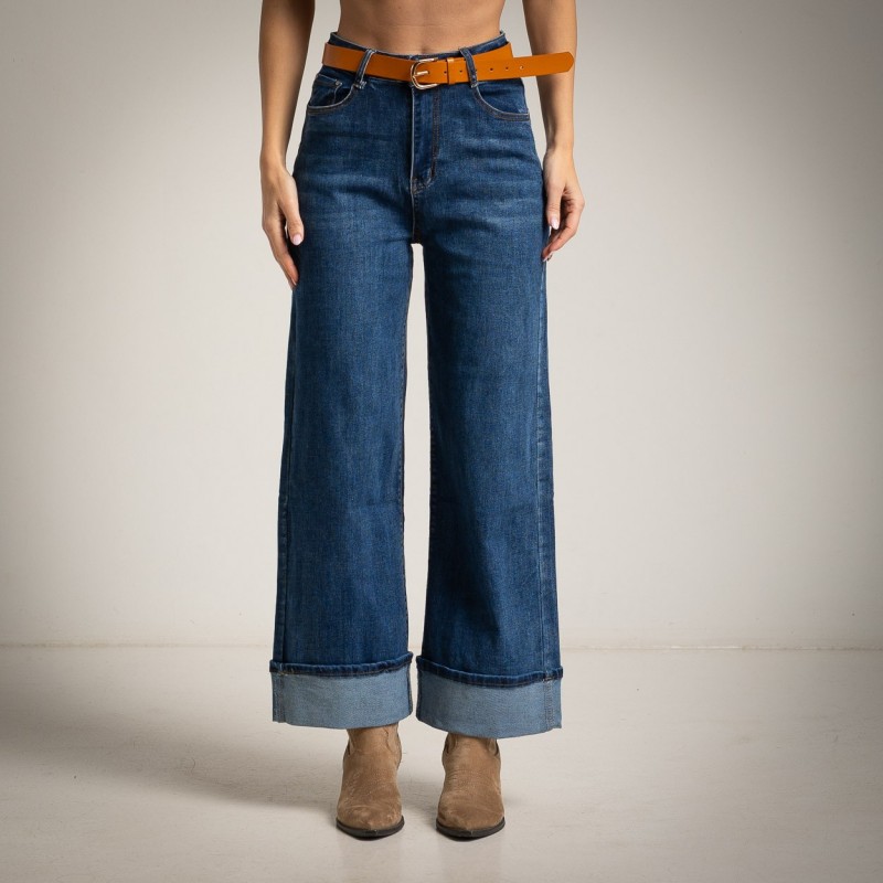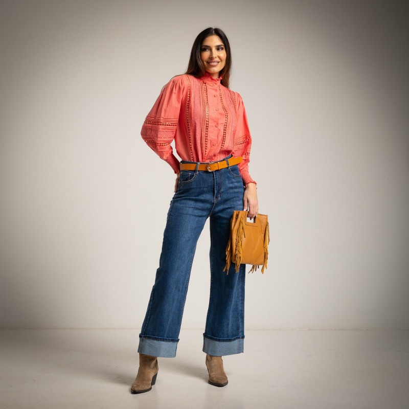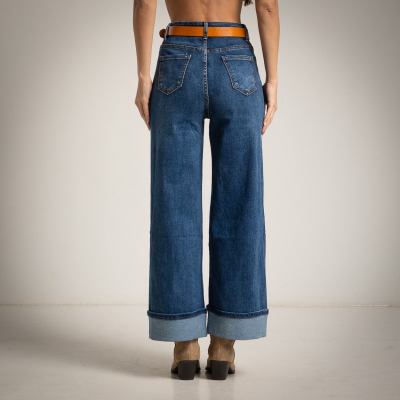 Pantalón denim talle alto, corte recto ligeramente acampanado, rematado con vuelta cosida. Cinco bolsillos.