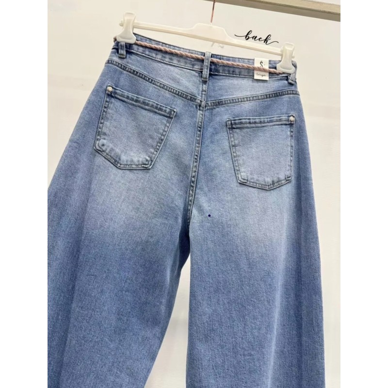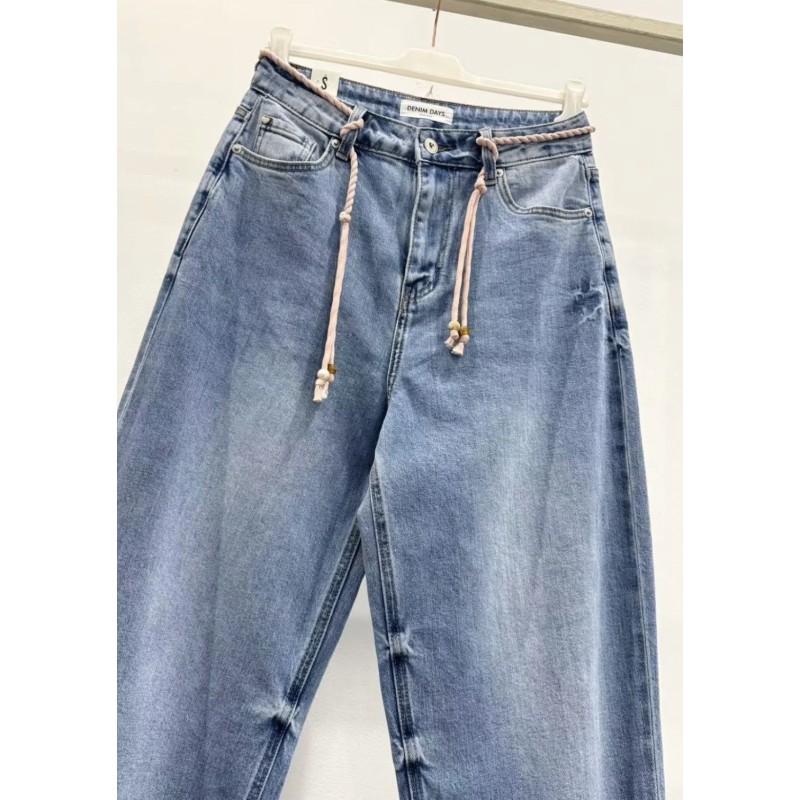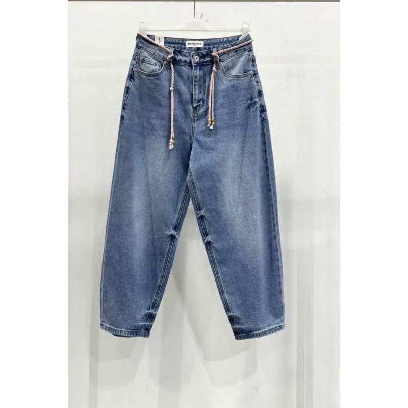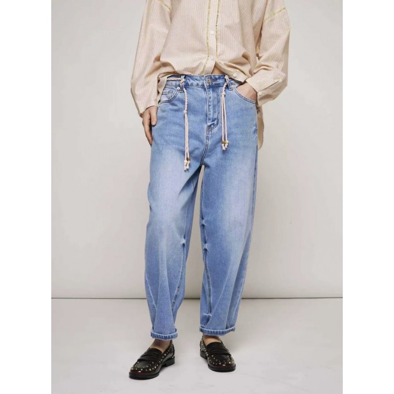 Pantalón vaquero tobillero efecto globo. Cinco bolsillos, adorno cordón de algodón en cintura.