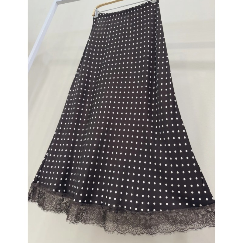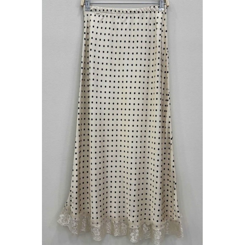 Falda larga efecto satén, estampado lunares y bajo lencero con encaje. Elástico en cintura.