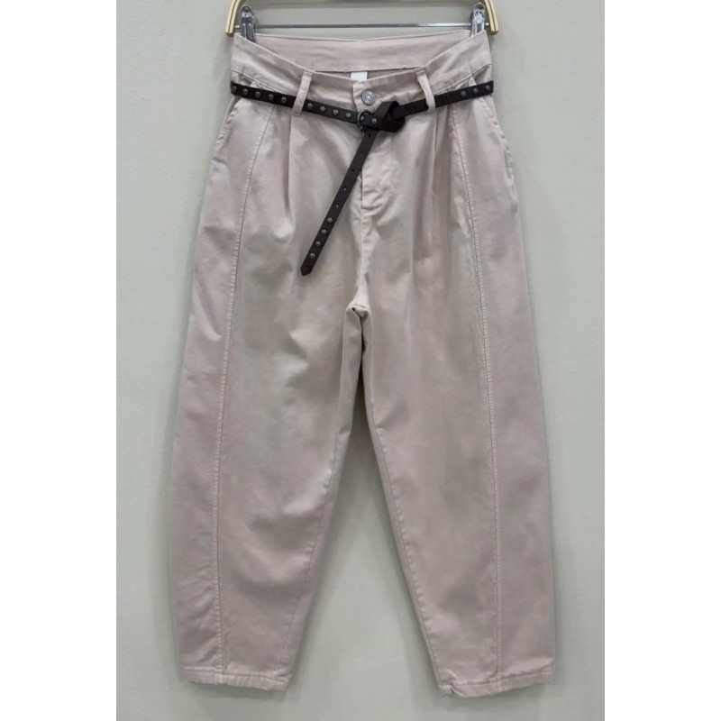 Pantalón corte globo, tobillero, cinturón de tachuelas incluido, pinzas y costura central en delantera. Bolsillos ocultos y de parche traseros.